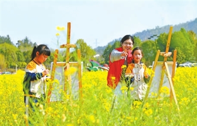 近日,浙江省台州市仙居县白塔镇第一幼儿园的孩子们在油菜花田间描绘春天的美景。王华斌 摄