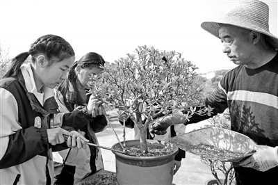 ①安徽省六安市裕安区河西小学学生在学习盆景栽植。 田凯平 摄