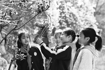 在山东省青岛市市北区宜阳路小学开展的爱鸟护鸟主题活动中,学生在为小鸟悬挂“新家”。 通讯员 王海滨 摄