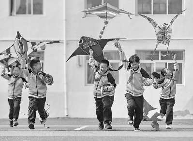 河北省秦皇岛市海港区桥东里小学学生放飞风筝。 通讯员 曹建雄 摄