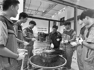 重庆航天职院教师在企业现场指导学生进行航空发动机部件检测实训。学校供图