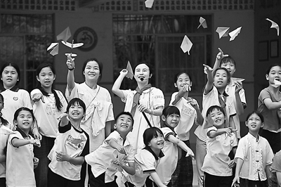 4月16日,在梧州市长洲区倒水镇大桥小学,送教老师和学生一起放纸飞机。