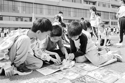 辽宁省大连市周水子小学的学生参加校园图书交换大集活动。