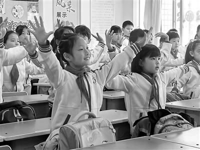 河北省秦皇岛市海港区的小学生在做室内课间手语操。周洪松 摄