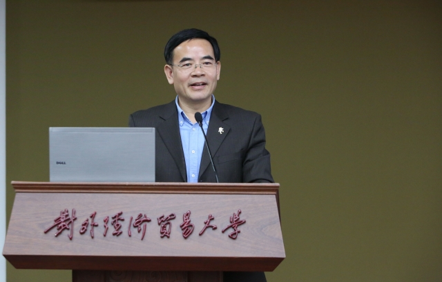 对外经贸大学党委书记蒋庆哲在报告会上讲话